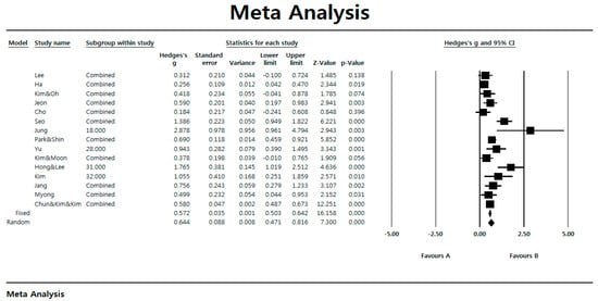The EXCEL Program (Dankook University, Cheonan, Republic of Korea) was used as the analysis tool for data coding, and the Comprehensive Meta-Analysis Program was used to analyze the effect size, homogeneity test, and publishing bias.