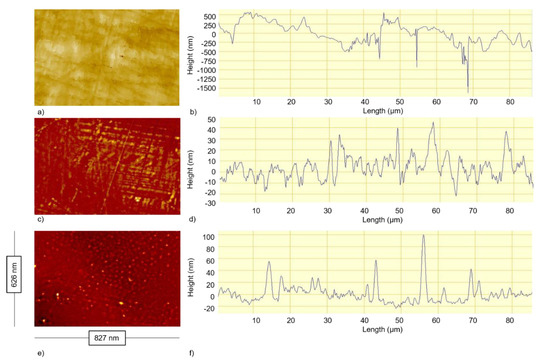 The changes observed in the roughness values for the surfaces were reflected in the Z profiles using optical profilometry (Figure 1). This demonstrated that the PTFE surface had the greatest difference in the surface features in terms of width and depth (Figure 1a,b), whilst the PMMA surface had the least amount of difference in the surface features with regard to the height irregularities demonstrated (Figure 1c,d). The PET surface revealed the most homogenous surface topography in terms of the height and width of the surface features demonstrated (Figure 1e,f).