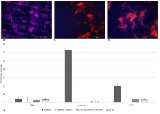 (a) Differential staining of the blood (rhodamine B; red) and bacteria (DAPI; blue) across the (a) PTFE surface (b) PMMA surface and (c) PET surface. (d) Percentage coverage of the bacteria retained on the surfaces before and after the cleaning regime (3% sodium hypochlorite) both in the presence and absence of a blood conditioning film (n = 3).