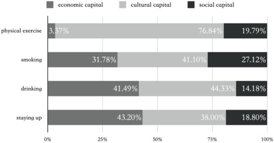 We used Figure 1 to display three capitals’ relative effects on four health behaviors. It can be observed that cultural capital was the most important, as it explained 76.8% of the total variation in physical exercise caused by three capitals, and about 40.0% in other health behaviors. The results suggest that cultural capital accumulated during early socialization has a long-term impact on health behaviors later in life. In addition, economic capital also exerted a relatively large effect on all health behaviors except physical exercise. Nevertheless, social capital had a relatively small effect on almost all health behaviors.