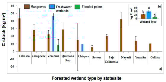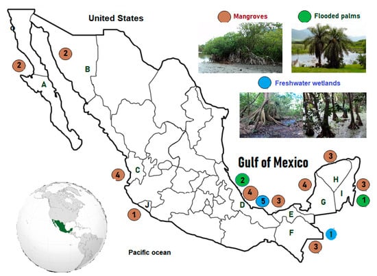 - Hernández, M.E.; Campos, A.; Marín-Muñiz, J.L.; Moreno-Casasola, P. Almacenes de carbono en selvas inundables, manglares, humedales herbáceos y potreros inundables. In Servicios ecosistémicos de las selvas y bosques costeros de Veracruz; Moreno Casasola, P., Ed.; Inecol ITTO Conafor INECC: Xalapa, VER, Mexico, 2016; pp. 121–129. Available online: https://www.itto.int/files/itto_project_db_input/3000/Technical/Servicios_Ecosostemicos_de_las_selvas_y_bosques_costeros.pdf (accessed on 3 November 2019). (In Spanish)