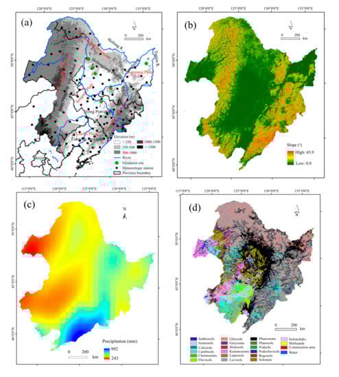 Study area showing the location, topography, meteorological stations, and the validation sites in the current study (a), slope gradient distribution (b), average annual total precipitation in 1970–2018 (c), and soil types (d). The numbers in Figure 1a indicate the sites of the published papers used for verifying our results in the current study (1 Dehui County; 2 Binxian County; 3 Baiquan County; 4 Keshan County; 5 Heshan Farmland; 6 Sanjiang Plain).