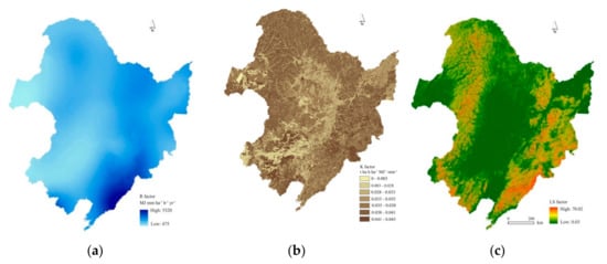 The Revised Universal Soil Loss Equation (RUSLE) input maps of the (a) R factor: rainfall–runoff erosivity factor (MJ mm ha−1 h−1), (b) K factor: the soil erodibility factor (t ha h ha−1 MJ−1 mm−1), and (c) LS factor: a combination of slope length L and slope gradient S factor (-).