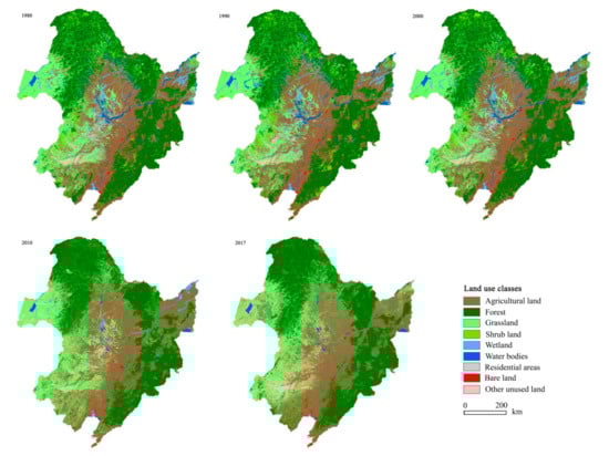 The land use types in 1980–2017 were shown in Figure 3 and numerically in Table 2. Spatially, forest was distributed in mountainous areas, and arable lands in the three plains (Figure 1). Among the land use classes, forest was predominant and covered 37% of the whole area, followed by arable land and grasslands covering 30% and 22%, respectively. These three kinds of lands occupied around 90% of the total. Shrubland, wetland, water body, and unused lands each covered 2% of the total area.