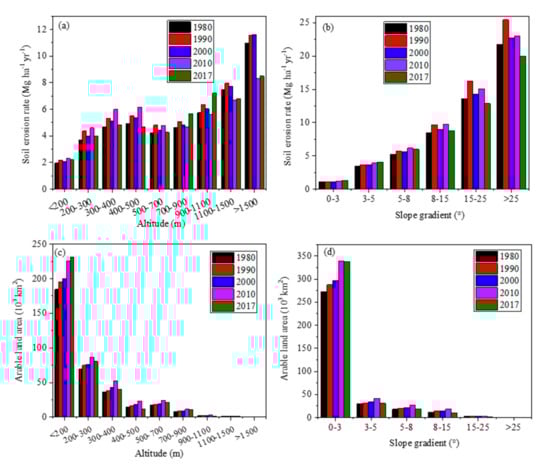 Distribution characteristics of soil erosion rates and the arable land areas according to altitude (a,c), and slope gradient (b,d) in the years 1980, 1990, 2000, 2010, and 2017.