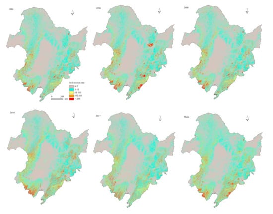 The spatial distribution characteristics of soil erosion rates in NEC in 1980, 1990, 2000, 2010, 2017, and their average in 1980–2017.
