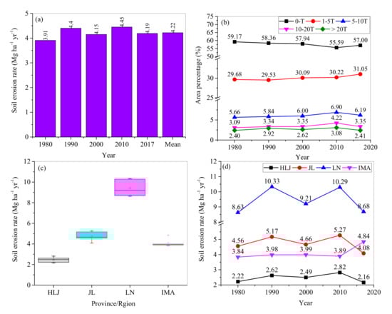 Changes of the mean annual erosion rate (a) and different erosion classes (b) in the whole of NEC with time, and soil erosion rates for three provinces and the Inner Mongolia Autonomous Region (IMA) (c) as well as their changes with time (d). The soil loss tolerance, T = 1.14 Mg ha−1 yr−1. HLJ, JL, LN, and IMA represent Heilongjiang Province, Jilin Province, Liaoning Province, and the eastern Inner Mongolia Autonomous Region.