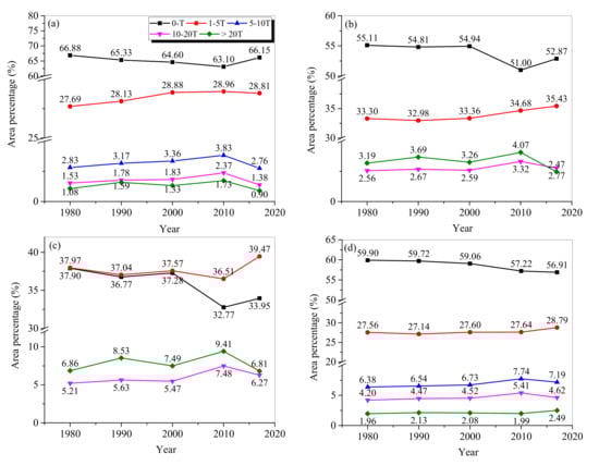 During the past decades, great changes in arable and forest lands occurred. Before 2010, arable land percentages increased from 27% in 1980, 29% in 1990, and 30% in 2000 to 35% in 2010, and then decreased to 32% in 2017, fluctuating from 41.34 million km2 in 1980 to 45.63 million km2 in 2010. In contrast, forest area percentages decreased from 38% in 1980, 36% in 1990, and 37% in 2000 to 34% in 2010, and then increased to 37% in 2017. The area percentages of grassland decreased too before 2000, ranging from 21% in 1980 and 20% in 1990 to 19% in 2000, and then increased sharply thereafter, occupying around 25% in 2010–2017. Shrubland percentages occupied around 4% before 2000 and less than 0.1% thereafter. The percentages of residential area in general increased from 1% in 1980 to 2% in 2017. On the contrary, the area percentages of wetland and water body decreased from 3% and 3% in 1980 to 0% and 1% in 2017, respectively. Unused lands kept unchanged through time. Since 2010, bare land has almost disappeared. Noticeably, great LULC change occurred in 2000–2010 (i.e., P3 in Table 2), except for those of the wetland and bare land in 2010–2017. Arable land also changed with time on different slopes. In areas with elevation above 200 m a.s.l and slopes above 5 degree, the distribution of arable land showed similar change patterns in different years, i.e., the areas of arable land increased from 1980 to 2010 and decreased in 2017. In contrast, in the low- elevation and gentle-slope regions, arable land area increased continuously (Figure 4c,d).
