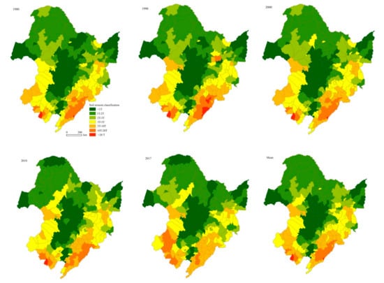 The soil erosion rate was calculated through multiplying the five factors (i.e., R, K, LS, C, and P). The data accuracies, especially the values of the C and P factors, greatly influence the results. Without consideration, the varied C- and P-factor values with time could result in biased estimation []. Furthermore, the datasets with 90 m resolution could influence estimation accuracy at plot or slope scales. However, although finer resolution could improve estimation accuracy, higher computational capacity is required, and it could not change the variation patterns of potential soil erosion.
