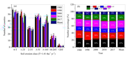 Changes of the number of counties (a) and the number percentages (b) with different soil erosion grades during 1980–2017.