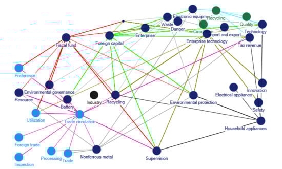 Clustering of policy themes in 2001–2004. Notes: The words in Figure 1 are listed as follows: Fiscal fund; Industry; Preference; Supervision; Enterprise; Environmental protection; Recycling; Environmental governance; Utilization; Resource; Household appliances; Electrical appliance; Technology; Tax revenue; Foreign capital; Import and export; Electronic equipment; Battery; Danger; Waste; Recycling; Quality; Circulation; Trade circulation; Inspection; Foreign trade; Processing; Nonferrous metal; Trade; Enterprise technology; Innovation; Safety.