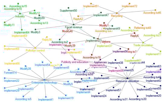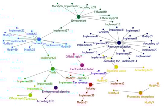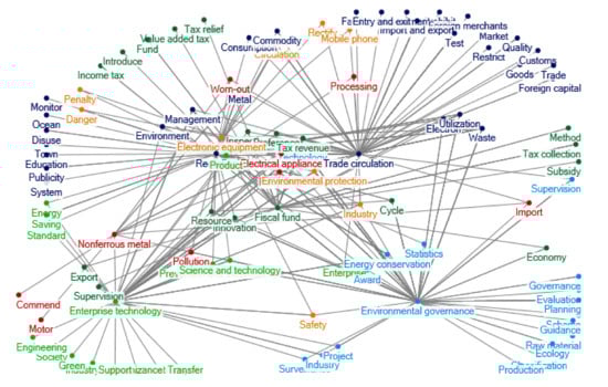 Clustering of policy themes in 2013–2016. Notes: The words in Figure 4 are listed as follows: Fiscal fund; Consumption tax; Subsidy; Local; Tax revenue; Income tax; Management; Catalogue; Fund; Examination and approval; Environmental protection; Standard; Document; Electronic Appliances; Preference Project; Standard; Value added tax; Disuse; Charge; Export; Import and export; Electronic equipment; Report form; Efficiency; Enterprise; Supervision; Governance; Ecology; Industry; Plan; Certification; Qualifications; Quality; Product; Statistics; Safety; Energy conservation; Qualification; Network; Electron; Industry; Logistics; Environmental governance; Notification; Rectify; Cut down; Objective; Scheme; Institutions; Information; Accident; Renewable; Order; Risk; Low carbon; Health; Environment; Production; Prevention and treatment; Classification; System; Green; Utilization; Construction; Investment; Circulation; Monitor; Mineral product; Recycling; Planning; Science and technology; Demonstration; Waste; Danger; Pollution; Evaluation; Saving; Industry type; Cycle; Publicity; Emission reduction; Resource; Energy; Economy; Battery; Market; Countryside Recycling; Identification; Education; Supply chain; Learning; Treatment; Method; Criterion; Base; Clearing; Dismantling; Harm; Land; Benchmarking; Solid; Items; Behavior; Measurement; Waste; Living; Petition; Citizen; City; Supply and sale; Worn-out; Commend; Procurement; Fire-fighting; Manufacture; Extension of responsibility; Development; Promote; Consumption; Random inspection; Communication; Producer; Technology; Import; Appliances; Household appliances; Apply; Fire prevention; Design; Equipment; Fund; Air-condition; Work; Test; Trade circulation; Exemption; Law enforcement; Hit; Recall; Investigation; Prohibit; Trend; Smuggle; Strategy; Entry and exit; Foreign merchants; Regulation; Trade; Adjustment; Notification; Commodity; Household appliances; Reform; Enterprise technology; Conference; Experiment; Research and development; Proposal; Appraisal; Verification; Assessment; Opinion; Organization; Anti-explosion; Experience; Engineering; Furniture; Equipment; Guide; Service; Raw material; Communication; Cluster; Encouragement; Inspection; Operation; Amendment; Forged or fake commodities; Structure; Innovation; Organization; Industry and trade; Region; Quality testing; Asset; Development; Guidance; Nonferrous metal Subsidy; Permission; Smelting.