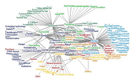 Clustering of policy themes in 2009–2012. Notes: The words in Figure 3 are listed as follows: Fiscal fund; External; Award; Consumption tax; Preference; Fund; Input; Research; Income tax; Behavior; Customs; Science; Value added tax; Governed by law; Catalogue; Management; Enterprise; Tax revenue; Deliberation; Planning; Document; Guide; Work; Imposition; Subsidy; Environmental protection; Statistics; Fund; Electronic Appliance; Investment; Technology; Import and export; Penalty; Standard; Automobile; Recycling; Cycle; Construct; Economy; Disuse; Asset; Science and technology; Industry; Environment; Energy; Industry type; Resource; Electronic equipment; Purchase; Open; Opinion; Service; Equipment; Quality; Facility; Demonstration; Qualification; Electron; Network; Product; Test; Mineral products; Treatment; Appliances; Green; City; Environmental governance; Responsibility; Policy; Report; Institutions; Protection; Operation; Reinforce; Water source; Save; Ecology; Surveillance; Standard of prevention and treatment; Manufacture; Pollution; Training; Encouragement; Governance; Safety; Emission reduction; Energy conservation; Waste; Land; Business use; Danger; Innovation; Import; Recycling; Exhibition; Suggestion; Division of labor; Clear up; Synthesis; Proposal; Complaint; Efficiency; Office; Supervision; Publicity; Information; Cognizance; Dismantling; Commodity; Certification; Development; Circulation education; Worn-out; Region; Industry; Supply and sale; Household appliances; Carry forward; Apply; Arrangement; Popularize; Operation; Method; Brand; To countryside; Trade-in; Household appliances; Trade circulation; Restrict; Prohibit; Countryside; Goods; Trade; Foreign merchants; Solid; Reform; Transformation; Classification; Consumption; Enterprise technology; Commonweal; Insurance; Remold; Monitor; Qualifications; Transfer; Filing; Main point; Platform; Evaluation; Export; Auditing; Implementation; Order; Health; Entrepreneurship; Proposal; Structure; Upgrade; Society; Commend; Capacity; Material; Project; Approve; System; Radiation; Light industry; Emerging; Engineering; Entry and exit; High-tech; Legal system; Elimination; Building; Plan; Adjustment; Production; Revitalization; Supervision; Pollution governance; Nonferrous metal; Substitution; Raw material; Battery; Metal.