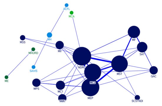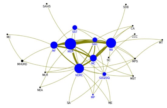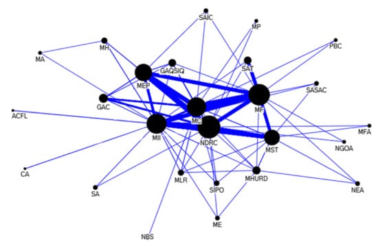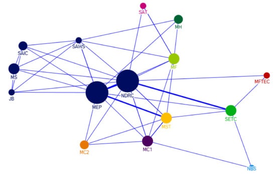 A policy document is often enacted by multiple government departments. By analyzing the departments involved in cooperation of policy making, the cooperation network map of government departments can be obtained to show the intergovernmental relationships in the progress of forming e-waste recycling policies. The issuing departments of policy documents is deemed as nodes. The node size represents the number of policy documents issued. The larger the node is, the more policies are issued. The thickness of the connection line between two nodes represents the number of cooperative documents issued. The thicker the connecting line is, the more cooperative documents are issued, and the closer the cooperation relationship between the two departments is [,].