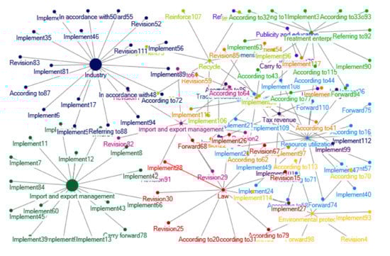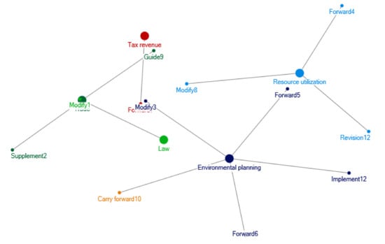 In Figure 9, Figure 10, Figure 11, Figure 12, the larger size of the nodes denotes larger relevant policy document quantity about the topics. In these figures, the words such as ‘Forward’, ‘Modify’, ‘Revision’, ‘Supplement’, ‘According to’, ‘Implement’ and so on, denote policies’ spread and derivation. That is: a policy from a upper government department or a same level of government department spreads to other governmental departments by ‘Forward’, ‘According to’, ‘Implement’ and so on; or a older version of a policy is improved and developed as an updated policy by ‘Modify’, ‘Revision’, ‘Supplement’ and so on to be further spread.