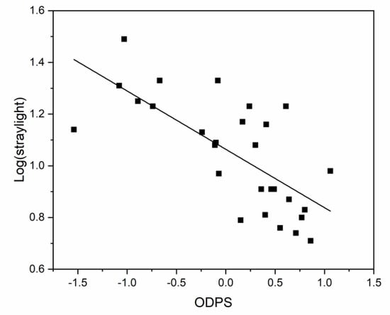 Finally, the multiple linear regression model, taking the ODPS as the dependent variable and the visual parameters as possible predictors, only returned the straylight parameter as a significant predictor of driving performance (ODPS). Figure 1 is a scatterplot of the ODPS against log(s) that reveals the relationship between the two parameters. The model indicated that the variable log(s) can predict 51.3% of the variance in the ODPS (R2 = 0.513; multiple r = 0.716). The equation for the model (Equation (1)) is shown below (standard errors are given in brackets):