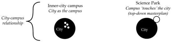 - Addie, J.P.D.; Keil, R.; Olds, K. Beyond Town and Gown: Universities, Territoriality and the Mobilization of New Urban Structures in Canada. Territ. Polit. Gov. 2015, 3, 27–50. [Google Scholar] [CrossRef]