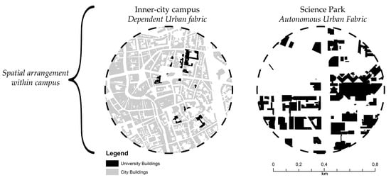 | Inner-city campus | Pedestrian-oriented design, with narrow streets and no strong differentiation between roads and sidewalks. Car circulation is often limited, allowing people to walk freely. | Squares or plazas which are part of the historic development of the city centre, surrounded by high-density buildings and streets. | Commonly found in the inner city are ‘mini/pocket parks’, which are green areas bounded by buildings. Public parks can be accessible at walking or cycling distance from these campuses. Public parks are defined as ‘publicly developed and managed open spaces, often located near the centre of a city’ [59] (p. 79). | |