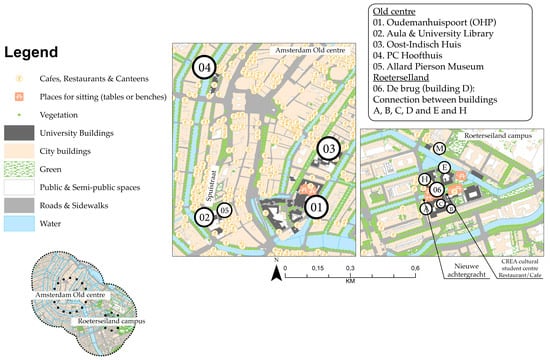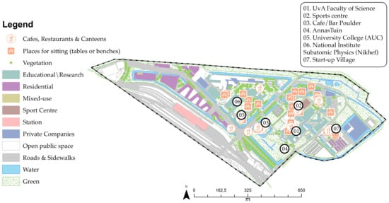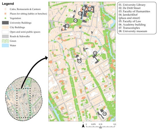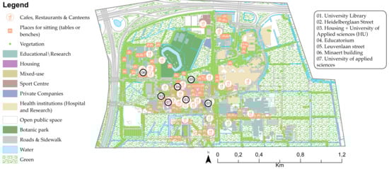 | Campus Buildings | Restaurant, Café or Canteen | Road and/or Sidewalk | Spaces between Buildings (SBB) | Green | Tables and Benches | Water | Vegetation | ||||||||||