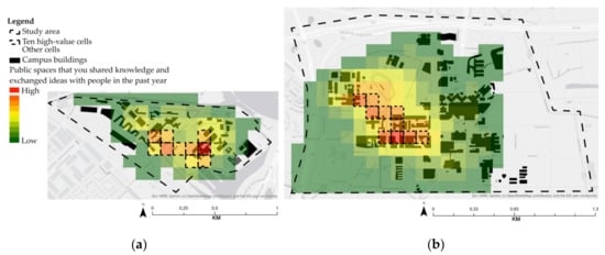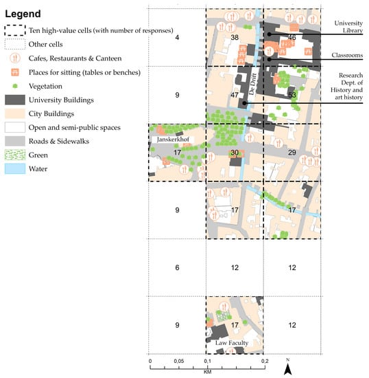 | Number of Valid Responses per Campus | Number of 100 × 100 m Cells within the Study Area | ||