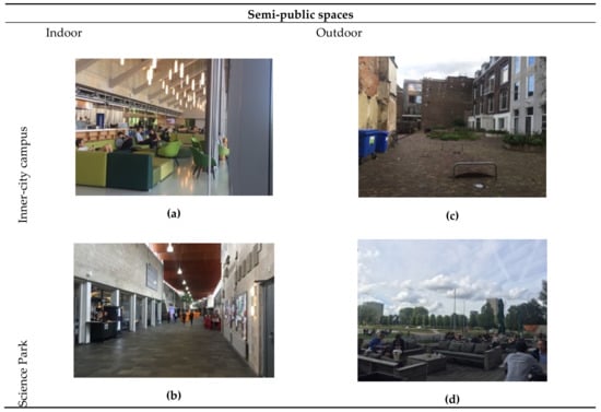 | Inner-city campus | Consists of corridors or shared spaces, open during university hours and mostly used by people who work or study on campus. For example, community gathering spaces with tables, canteens and coffee corners. | Consists of open-air and semi-private backyards. Spaces limited by design or management policy, with access through doors or gates. These areas are mainly exclusive to university students and employees. | ||