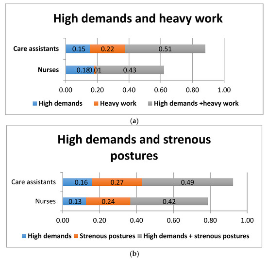 The differences between nurses and care assistants observed in the present study may have methodological, as well as substantial, reasons. The fact that there were fewer nurses than care assistants in the study affected the statistical measurements, and the large confidence intervals also indicated heterogeneity among the employees of both groups. As shown in recent research, the working conditions among nurses, as well as among care assistants, are diverse with respect to work obligations and work organizations [24,25,26,27,28,30,31,32,33,34,36]. Some nurses and care assistants who reported both harmful psychosocial and physical challenges may be able to handle their activities in a planned way, while other employees have to work in urgent situations more regularly. Further, nurses are probably, to a higher degree than care assistants, able to foresee and avoid some situations that include heavy lifting or strenuous postures, even when their work is stressful. It is also possible that care assistants spend more time than nurses in combinations of stress and heavy physical work.