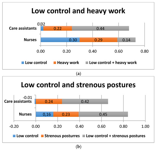 The main difference between nurses and care assistants was that two measures of relative excess risk due to interaction and attributable proportion (RERI and AP) were significant, and the synergy index (S) was close to significance among care assistants, but none of these measures were significant among nurses.