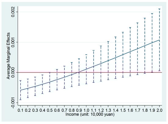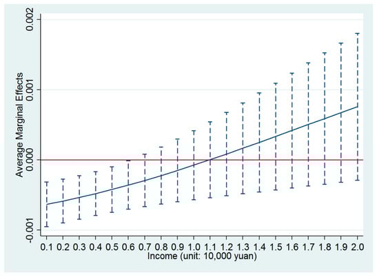 After including the interaction term PM2.5 × income, the regression result of column (2) in Table 4 shows that the coefficient of PM2.5 × income was significantly negative, which confirmed the trade-off between a higher income and poorer air quality that was faced by the migrants when deciding whether to settle down in a city. In other words, the influence of air quality on the settlement intentions of Chinese migrants was conditional on their incomes. As income opportunities increased at a migrant’s location, the negative influence of poorer air quality on the settlement intention at that location gradually decreased, which indicated that a higher income could make up for the lost utility caused by poorer air quality. Figure 1 further shows the average marginal effect of the variable PM2.5 on the settlement intentions of Chinese migrants. As shown in the figure, with the increasing income of the migrants, the average marginal effect of PM2.5 gradually increased from significantly negative to eventually being insignificant. Therefore, the results above indicated that a higher income weakened the negative influence of poor air quality on the settlement intentions of Chinese migrants.
