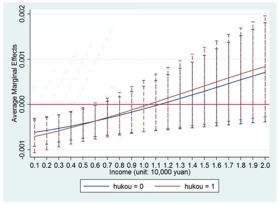 where the coefficients αh (h = 0 or 1) of the interaction term PM2.5 × income × hukouh represents the difference in the preferences of income and air quality in the settlement decisions of Chinese migrants with either an agricultural “hukou” or a non-agricultural “hukou.” Column (1) in Table 5 reports the estimated results of the coefficients of the variables in model (3), which showed that the coefficients of the interaction term PM2.5 × income × hukouh were significantly positive. On this basis, Figure 2 reports the average marginal effects of PM2.5 on the settlement intentions of the migrants with different types of “hukou.”