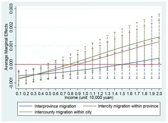 According to Figure 3, with the increase of income, the negative influence of PM2.5 on the migrants’ settlement intentions decreased the fastest in the intercounty (within the same city) samples, followed by the intercity (within the same province) samples, and finally the interprovince samples. That is to say, migrants with a longer migration distance preferred income and were less likely to substitute income for air quality in their settlement decisions. The main reason for this was that 92.73% of Chinese migrants in the sample made their migration decisions for economic reasons, such as working or doing business, to improve their incomes. For all migrants with economic reasons for migrating, the migrants that undertook interprovince migration, intercity migration, and intercounty migration accounted for 50.14%, 32.83%, and 17.03%, respectively. Hence, migrants with a longer migration distance paid more attention to income than air quality.