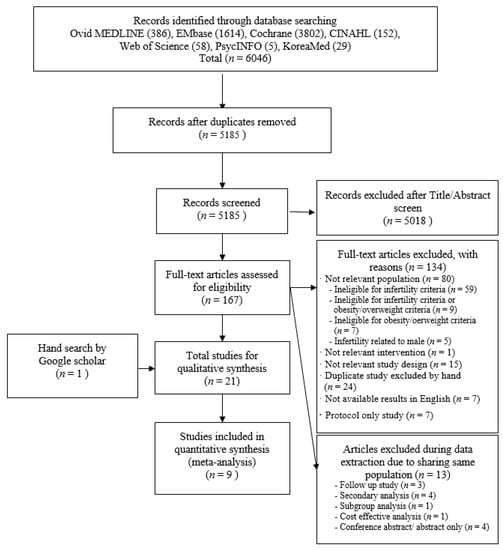 Kim, S.Y.; Park, E.-S.; Kim, H.W. Effectiveness of Non-Pharmacological Interventions for Overweight or Obese Infertile Women: A Systematic Review and Meta-Analysis. Int. J. Environ. Res. Public Health 2020, 17, 7438. https://doi.org/10.3390/ijerph17207438
