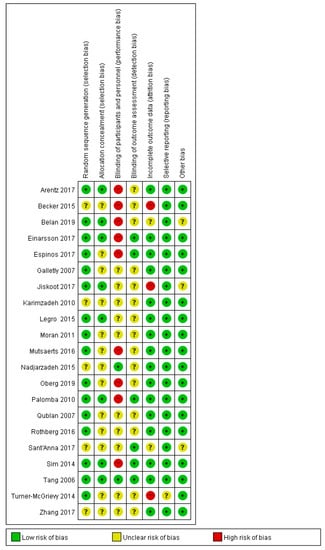 - Higgins, J.P.; Altman, D.G.; Gøtzsche, P.C.; Jüni, P.; Moher, D.; Oxman, A.D.; Savović, J.; Schulz, K.F.; Weeks, L.; Sterne, J.A. The Cochrane Collaboration’s tool for assessing risk of bias in randomised trials. BMJ 2011, 343, d5928. [Google Scholar] [CrossRef]