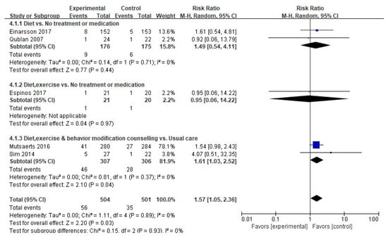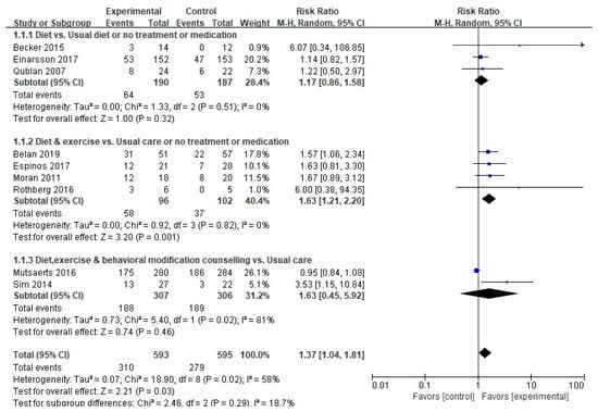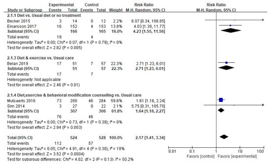 | Type of Intervention | Diet-based intervention Diet vs. Others Diet (Type of Diet) Diet plus exercise intervention Diet, exercise plus behavioral modification Lifestyle intervention combined medication Supplementation | 5 (23.8) 3 (14.3) 2 (9.5) 4 (19.0) 5 (23.8) 5 (23.8) 2 (9.5) |