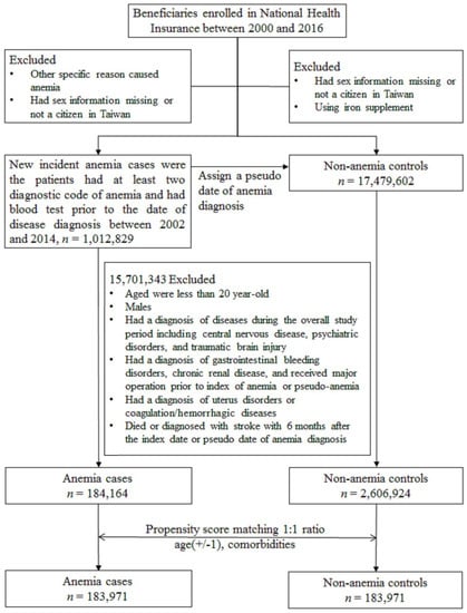 A pseudo date of an anemia diagnosis was randomly assigned to controls corresponding to the pool of index dates of anemia patients since they did not have an index date. The same exclusion criteria for both cases and controls were used: being aged less than 20 years; not being a citizen of Taiwan; being male or missing sex information; having been diagnosed with a central nervous system disease, psychiatric disorder or traumatic brain injury; having other diseases or medical conditions that were likely to cause anemia, such as gastrointestinal bleeding disorders and chronic renal disease, or having undergone major surgical procedures before the index date; having a diagnosis of uterine disorders or coagulation/hemorrhagic diseases; and having died or been diagnosed with a stroke within 6 months after the index date or pseudo date of anemia diagnosis. These criteria were applied to exclude people with either a higher risk of stroke or anemia due to an acute illness.