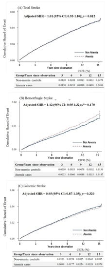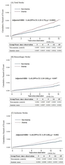 Cumulative incidences of competing risks (CICRs) of (A) total stroke, (B) hemorrhagic stroke and (C) ischemic stroke in anemia cases and non-anemia controls aged <50 years.