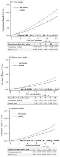 Cumulative incidences of competing risks (CICRs) of (A) total stroke, (B) hemorrhagic stroke and (C) ischemic stroke in anemia cases and non-anemia controls aged <50 years and limited to a follow-up period up to 50 years of age.