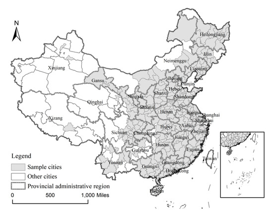 We use the prefecture as our research unit. Prefectures in China are second-level administrative divisions ranked between provinces and counties. In studying prefectures, we obtain a larger sample than we would have at the provincial scale and more detailed statistical data than we would have at the county scale. Thus, the sizes of prefectures render them an appropriate unit of analysis [62]. We select 286 prefecture-level cities and above with relatively complete information for the study period. Figure 1 maps the locations of the sample cities and boundary of the provincial administrative region. These samples have complete information on administrative jurisdiction and detailed statistical data [63], and they are distributed across most of China, which are thus nationally representative [21].