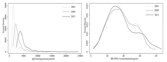 To observe effects of PM2.5 pollution on housing prices in time series, we calculate the datasets for 2005 and 2009 to draw comparisons. The results are shown in Table 3. OLS estimates are reported in the first column. The R2 values exceed 0.75, indicating that they both have good explanatory power. The coefficients of PM2.5 pollution for 2005, 2009, and 2013 are negative, this coefficient is not significant for 2005 and it is significant at the 5% level in 2009. Relative to the absolute values of the coefficients across the three time sections, the effects of PM2.5 pollution on housing prices continuously increase. The coefficient in 2013 is nearly three times the value in 2005 (−0.0661), potentially reflecting increasing concern for the impacts of air pollution on life quality.