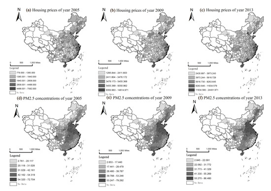 Spatial distribution of housing prices and PM2.5 concentrations from 2005 to 2013. (a–c) represent the distribution of housing prices in 2005, 2009 and 2013 respectively; (d–f) represent the distribution of PM2.5 concentrations in 2005, 2009 and 2013 respectively.