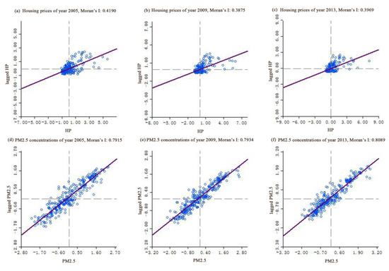 Moran’s I scatter of housing prices and PM2.5 concentrations from 2005 to 2013. (a–c) represent the Moran scatter of housing prices in 2005, 2009 and 2013 respectively; (d–f) represent the Moran scatter of PM2.5 concentrations in 2005, 2009 and 2013 respectively.