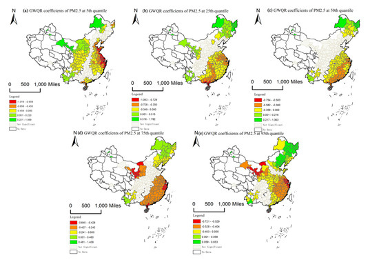 According to means and medians of GWQR coefficients in Table 4, the trends of PM2.5 coefficients are similar to QR estimates for 2013. The coefficients are dominated by a negative correlation for PM2.5 pollution, and these negative relationships become stronger at most quantiles and especially at the 5th and 95th quantiles. GWQR model coefficients are spatially varying throughout the study area. Following Chen’s method [38], spatial non-stationary effects of the response variable and accompanying predictor variable are assessed by judging whether the interquartile ranges (IQRs) of the localized coefficients are more than twice the standard errors of the global estimates. Table 4 indicates that IQRs of the local estimates of PM2.5 pollution were at least twice the standard error of global estimates in 2013. Our results suggest that spatial relationships between housing prices and PM2.5 pollution indeed vary across the studied prefecture-level cities.