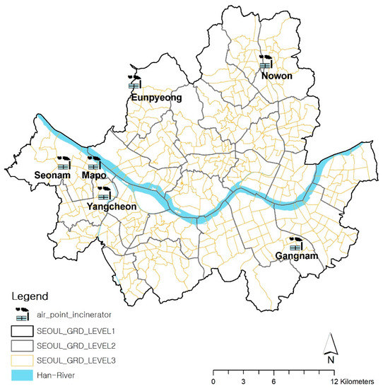 In Seoul, over 10,000 tons of MSW are produced daily. While approximately 65% of MSW was recycled in 2012, the percentage of MSW that underwent incineration increased from 2% in 1996 to 27% by 2012. A total of 12 incinerators at six MSW incineration plants were installed from 1996 to 2008. The locations of these six incineration facilities are mapped in Figure 1. The locations of the incinerators were used by converting the addresses provided by the Seoul Metropolitan Government into spatial data by geocoding based on the TM (Transverse Mercator) coordinate system. All six facilities dispose of household waste, and the quantities of waste depend on size. Eunpyeong incinerator is the smallest and handles up to 48 tons of waste per day, while Seonam incinerator processes up to 150 tons a day. Mapo incinerator can handle up to 750 tons while Yangcheon facility can handle up to 400 tons of waste per day. Nowon incineration facility can treat 800 tons of waste per day. Gangnam incinerator is the largest, which can handle up to 900 tons of waste per day.