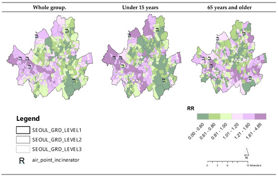 To achieve the main research objectives, this study analyzed the risk of asthma-related admission based on the separation distance from incineration facilities using the RIF. In the risk analysis using the RIF, the most interesting finding was that the risk of asthma-related admissions in areas adjacent to the incineration facilities (0–2 km) across the whole group, children group, and senior group were significantly higher than the reference values of the entire study population of Seoul (ISRR = 0.99). The relative risks of asthma-related hospitalization were 1.13 (95% confidence interval (CI): 1.10–1.17), 1.12 (95% CI: 1.08–1.17), and 1.18 (95% CI: 1.10–1.27) for all ages, those aged below 15 years, and those aged 65 years and older, respectively. Interestingly, the risk ratio of the senior group increased compared to that of the whole group and children group. The reason the elderly have a higher asthma risk than the children group seems to reflect the general trend. According to Chang [23], the prevalence of asthma in children was around 5–9%, but decreased to 3% in young adults, but asthma increased after 50 years, indicating a high prevalence rate of 6.8–12% among those 65 years or older.
