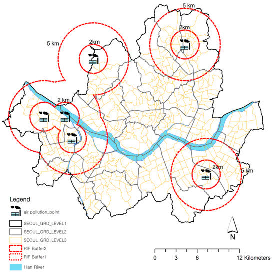 In terms of investigating the statistical relationship between proximity to the incinerators and the relative risk of asthma-related admissions, risk analysis was performed in the RIF. It is important to determine the buffer distance from the incineration facility in order to determine the correct neighborhood for analysis. In a previous study [18], which was performed on the air diffusion modelling of a municipal waste incineration facility, the air quality evaluation range had a radius of 5 km for the incineration facility, while the maximum ground level concentration of air pollution was found in areas within a 2-km radius of the facility. Based on these existing empirical results, we analyzed the relative risk of asthma-related admissions for the sub-districts located within buffer zones at distances of 2 km and 2–5 km from locations of the incineration facilities. Sub-divisions (dongs) entirely falling within the buffer area, as well as sub-divisions (dongs) with more than 50% of their area in the buffer, were included in the analysis. The buffer zone within 2 km of the incinerators includes 49 sub-divisions (dongs), 12% of the 424 sub-divisions in Seoul, and the 2–5 km buffer zone contains 138 sub-divisions, 33% of the total. The corresponding incident rate and the ISRR (indirectly standardized relative risk) were recalculated according to the buffer zone using the RIF. The risk analysis by buffer utilized the RIF. Eight countries (Britain, Denmark, Finland, Ireland, Italy, Spain, Sweden, and Netherlands) have used the RIF, developed in 1999, for the European Health and Environment Information System (EUROHEIS) project, and the US Centers for Disease Control and Prevention (CDC) National Environmental Public Health Tracking (EPHT) Network has utilized RIF. The validity and reliability were improved as an analytical tool through various projects and research conducted by numerous counties [19].
