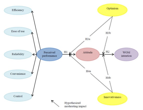 Performance is a fairly comprehensive term and the heavy reliance in evaluating performance was traditionally placed on accounting-based measurement such as market share, net earnings, or return on investment in the domain of hospitality []. However, these financial indicators were debated as inadequate in the service sector and have evolved to encompass various stakeholders, and now include business processes, corporate social responsibility, customer satisfaction, employee turnover, learning, diverse management, and so forth as a part of a balanced scorecard (BSC) [,]. Following the trends driven by today’s changing business environments and the supports in academia to focus on non-financial performance in the context of hospitality and tourism [], investigating how consumers perceive the hotel performance would be meaningful for a firm’s long-term success. More importantly, examining perceived performance of a smart hotel in predicting customers’ responses (i.e., attitude and word-of-mouth intention) would offer business insights to the practitioners since a smart hotel has not been fully commercialized as of yet.