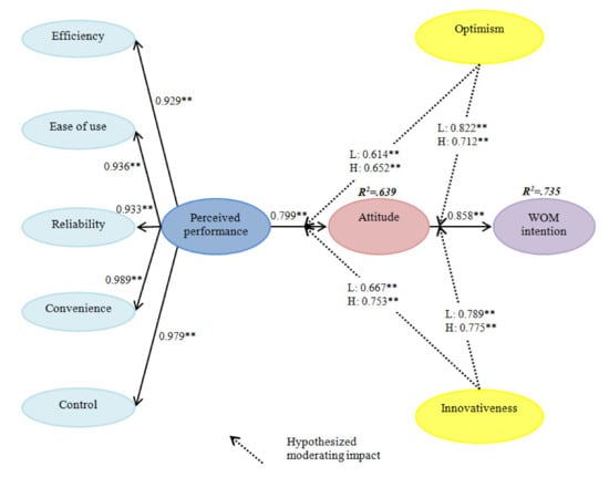 An invariance test was performed to evaluate the hypothesized moderating influence of technology readiness through the comparison of the chi-square difference between the unconstrained and constrained models according to the difference in the degrees of freedom []. In order to examine the moderating effect of optimism, a baseline model containing the 105 low optimism group and 178 high optimism group was created. All loading values between the low optimism group and high optimism group were restricted to be equal. Our result indicated that the goodness-of-fit statistics of the baseline model were acceptable (χ2 = 1578.288, df = 670, p < 0.001, χ2/df = 2.254, RMSEA = 0.067, CFI = 0.905, IFI = 0.906, NFI = 0.843, TLI = 0.893). This baseline model was then compared to the nested model where a specific link of interest was restricted in an equivalent way. A chi-square test was conducted for this empirical comparison. Table 4, accordingly, displays the results of the baseline model evaluation and chi-square test. Our findings showed that the path from perceived performance to attitude was significantly different between the low optimism group and high optimism groups (Δχ2 (1) = 6.926, p < 0.01). More specifically, the intensity of the association between perceived performance and attitude (βlow group = 0.641, p < 0.001; βhigh group = 0.652, p < 0.001) was significantly greater in the group of people with a high degree of optimism. Therefore, hypothesis 3a was supported. However, the link from attitude (Δχ2 (1) = 0.065, p > 0.05) to word-of-mouth intention was not statistically significant between these two groups. Thus, hypothesis 3b was not supported.