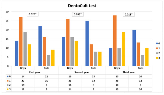 DentoCult SM test scores of boys and girls in the first, second, third year of the study. The statistical analyses were performed using the Chi-squared test. * p > 0.05.
