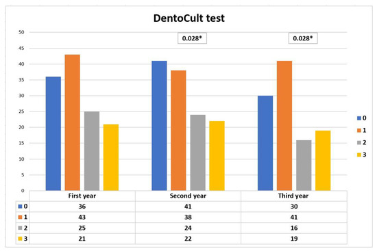DentoCult SM test scores in the first, second, third year of the study. The statistical analyses were performed using the McNemar’s test, * p < 0.05.