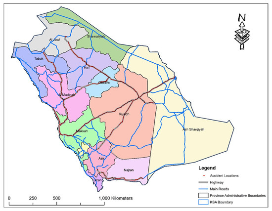 The enormous growth in motorization and road infrastructure has brought alarming road safety concerns in recent years in KSA. A recent study conducted by Turki et al. indicated that, on average, 19 persons are killed, and approximately four are injured in RTCs every day in the KSA [13]. Average crash to injury ratios of 8:6 and 8:4 are reported for the entire country and eastern region in the KSA, respectively, which are significantly high compared to the global ratio of 8:1 [14,15]. The economic losses due to RTCs in KSA are estimated to be around 4.3% of the national GDP [2]. In the literature, few studies have focused on identifying crash contributing factors to guide appropriate management strategies for mitigation [14,16,17,18]. Locally conducted studies suggest that factors such as driver distractions, over speeding, and aggressive driving, especially among young KSA adults, are the main factors that have contributed to an increase in crash occurrence and worsened injury severity [15,19,20,21]. In recent years, few road safety measures (such as the installation of the SAHER program, strict enforcement of traffic rules, the imposition of heavy fines on violators, etc.) have been initiated; however, the road safety situation has only marginally improved.