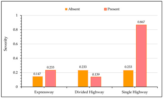 Figure 3 shows the impact of the highway type on crash severity with the x-axis representing the absence/presence of a specific highway category, and the y-axis displaying the severity outcome. Severity values close to “0” indicate that there are very low prospects of the crash being fatal, while a severity value approaching “1” represents a higher probability of a fatal crash occurrence. It may be noted from Figure 3 that the presence of an expressway increases the probability of a fatal crash by over 9%. For the current study, expressways were designated as the facilities with a minimum of three lanes in each direction and travel speed above 120 Km/h. Although freeways facilities have a forgiving design and are accompanied by protecting structures such as barriers, crash cushions, etc., the high travel speeds aggravate the impact during a crash event. The low traffic volume and forgiving road design along freeways sometimes also make the drivers more relaxed, which also intensifies the severity of crashes. These observations are intuitive and consistent with several previous studies [36,82,83]. On the other hand, the presence of a divided highway increases the chances of non-fatal crashes. A divided highway separates the traffic in the opposing direction by a median and has two lanes in each direction with a travel speed lower than expressways. Having relatively low speeds and high traffic volume could be the potential evidence for non-fatal crashes. Similarly, the majority of crashes reported on divided highways are rear end, which is also an indicator of non-fatal crashes [84,85]. Crashes occurring along a single highway have the highest probability of being fatal since there is no separating medium between the opposing traffic, and most of the crashes are head-on. It has been established that head-on crashes are associated with high fatality [86,87]. Figure 4 shows the relationships between the number of lanes in each direction versus observed crash severity. It is evident from the figure that severity increases as the number of lanes in each direction increases. With an increase in the number of lanes, drivers usually drive at high speed and are relatively relaxed, which could be one possible argument for increased crash severity.